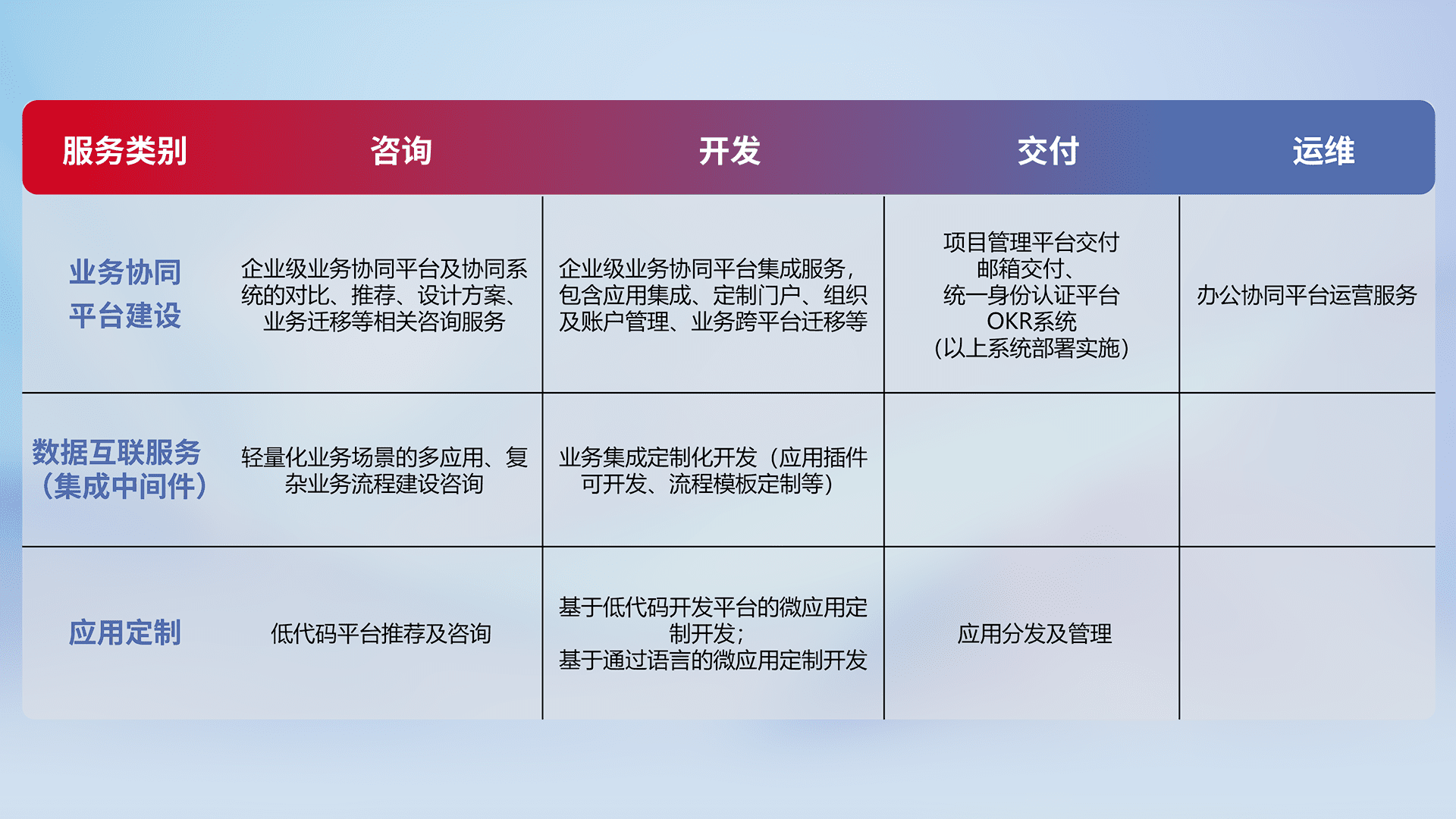 针对钉钉、、、企微、、IDaas等平台级产品提供产品的规划、、、方案、、交付、、定制化开发等服务,,实现如统一协同办公、、、、智能客户服务、、混合会议管理、、智能数据查询、、、等业务场景,,,,实现数字化转型。。。